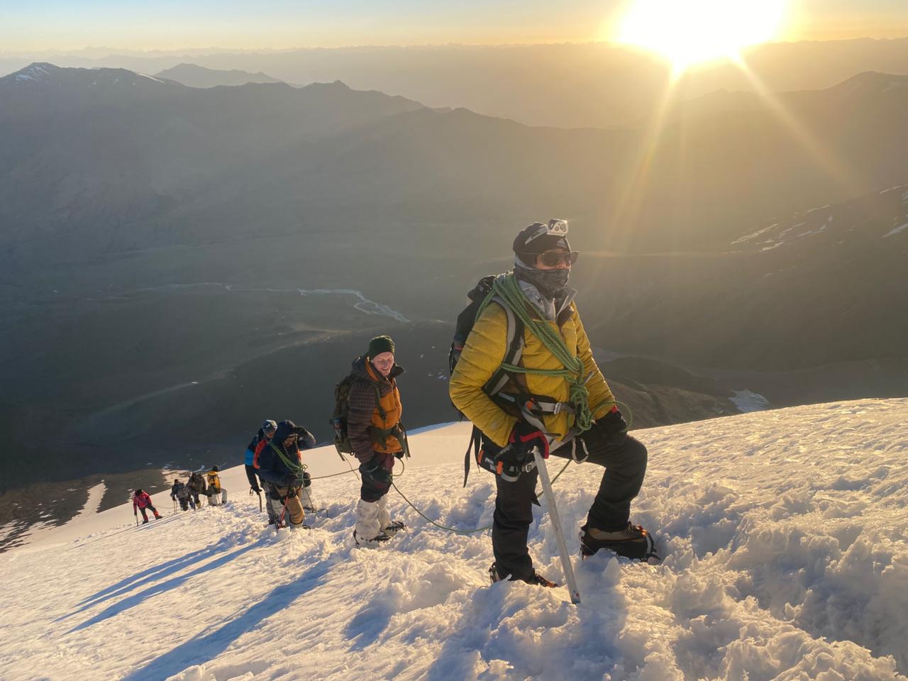 Above Base Camp, climbers encounter snowfields, glacier terrain, and fixed-rope sections leading to Advanced Camp and Summit Camp.