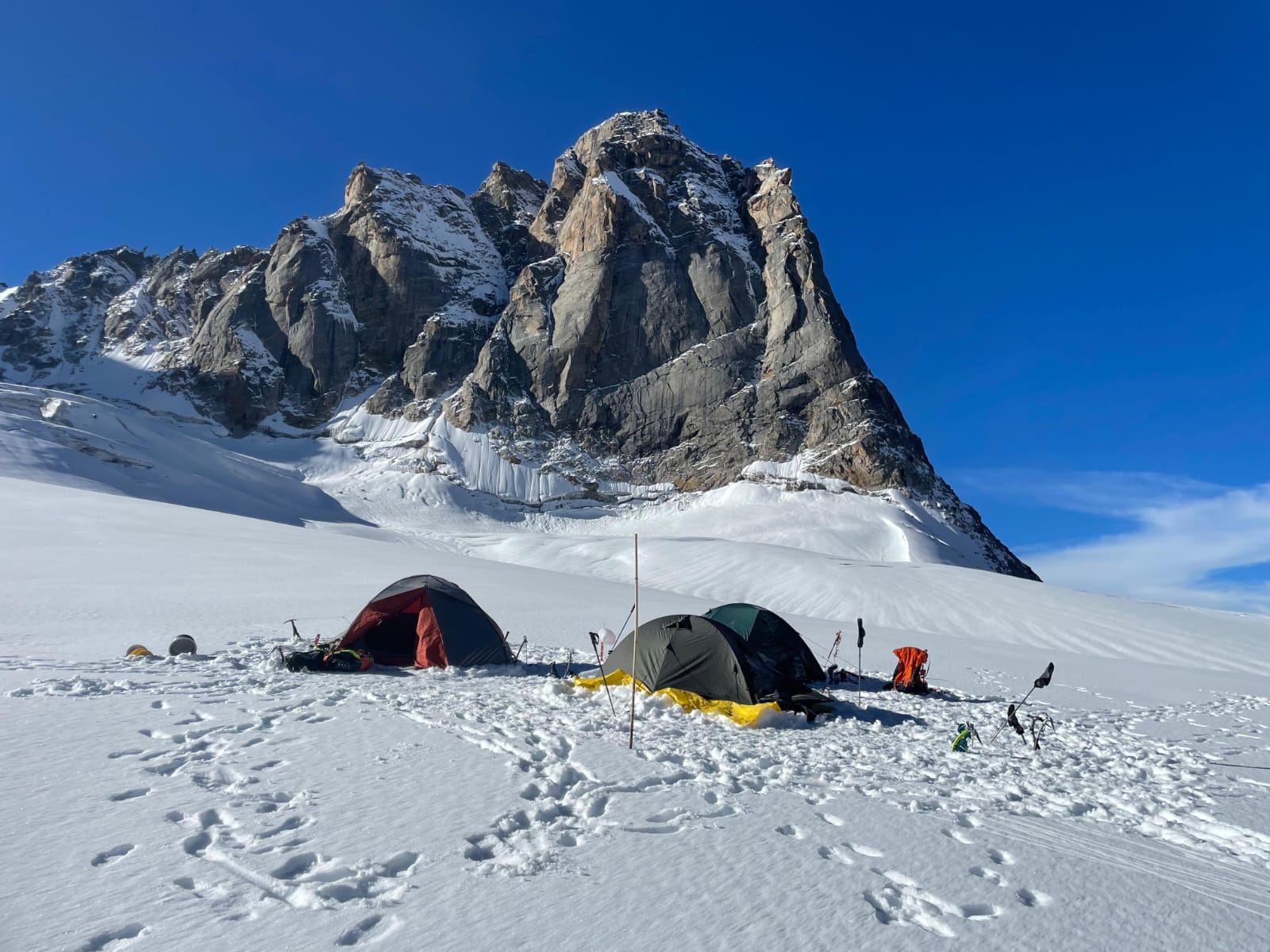 Higher camps are established on icy slopes and exposed ridges as climbers gradually gain altitude and acclimatize.